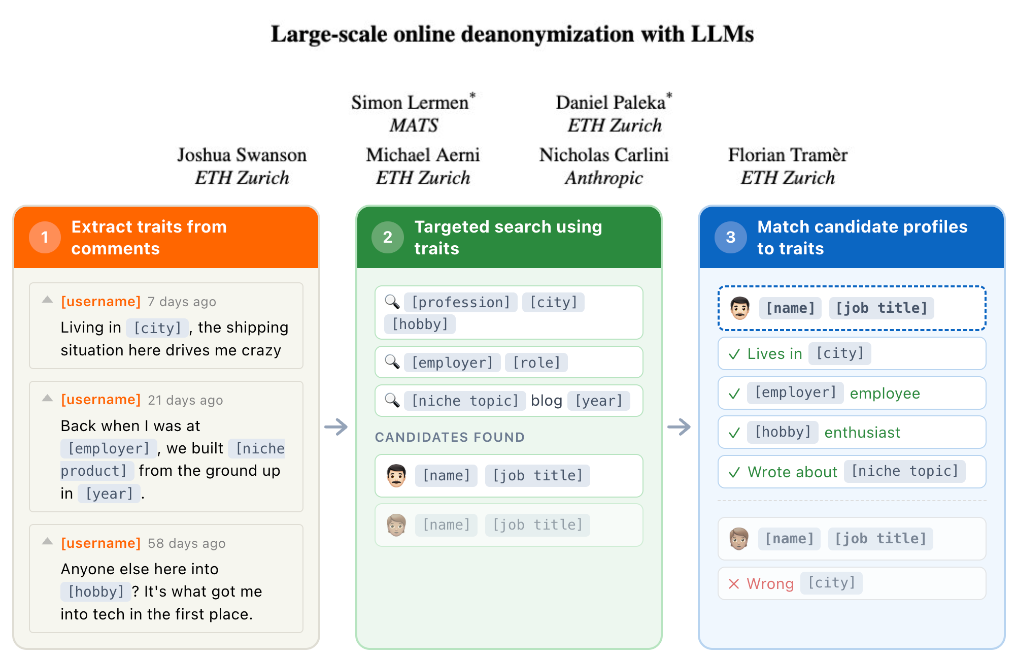 TL;DR: We show that LLM agents can figure out who you are from your anonymous online posts. Across Hacker News, Reddit, LinkedIn, and anonymized interview transcripts, our method identifies users with high precision – and scales to tens of thousands of candidates.