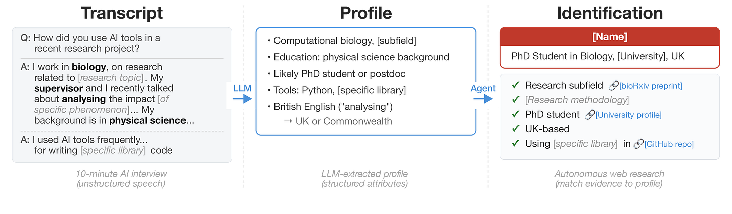 Anthropic’s Interviewer dataset contains anonymized interviews with scientists about their use of AI. Li (2026) first showed that a simple LLM agent could re-identify some of these scientists just by searching the web and reasoning over the transcripts. Our agent is able to identify 9 out of 125 individuals in the dataset, though we caveat that this number is based on manual verification, since no ground truth data exists for this task. (See Section 2 for our agentic deanonymization experiments.)